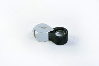 Compact 20X triplet eye loupe with an 18mm glass lens for sharp, distortion-free viewing—ideal for jewelry inspection, gemstone grading, watch repair, model making, and general magnification. Folding, pocket-sized, durable, and includes a protective case.