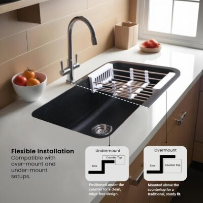 The sink features noise-reducing construction for quieter kitchen use and is highly resistant to scratches, stains, and heat, ensuring long-lasting performance.