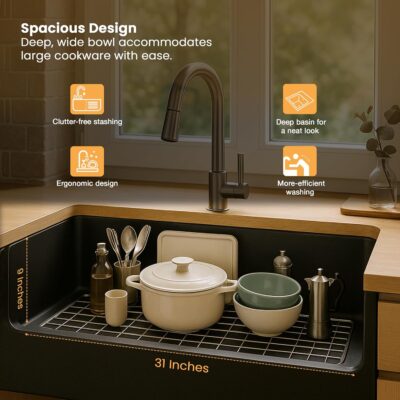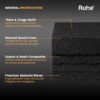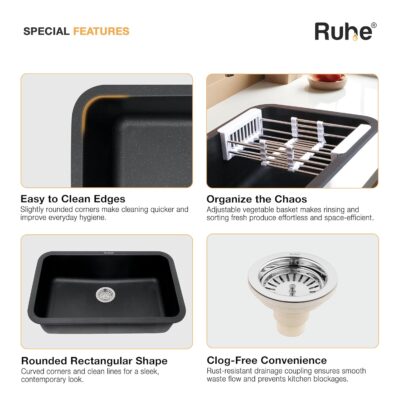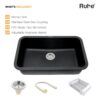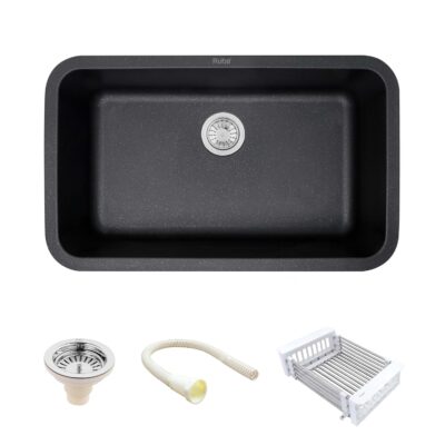 Ruhe® Matte Black Quartz Single Bowl Kitchen Sink (31x19x9 Inches, Round Corners) is a premium granite composite kitchen sink designed for durability, functionality, and modern aesthetics. Its matte black finish adds a sleek and contemporary look, while the round corners make cleaning easier and enhance safety. The sink features noise-reducing construction for quieter kitchen use and is highly resistant to scratches, stains, and heat, ensuring long-lasting performance. The package includes a coupling, waste pipe, and vegetable washing basket, providing a complete solution for daily kitchen tasks. Ideal for modern kitchens, this sink combines elegant design, robust build, and practical functionality.