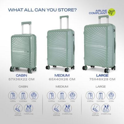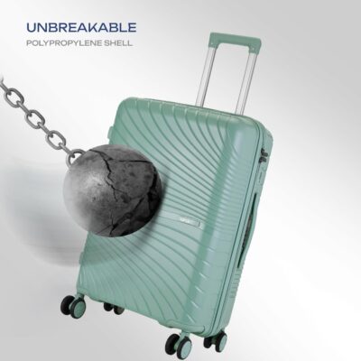 Safari Atlantis is a 3-piece trolley bag set in green with cabin, medium, and large sizes, crafted from durable polypropylene. Equipped with 8 wheels and anti-theft zippers, it’s built for secure and smooth travel.