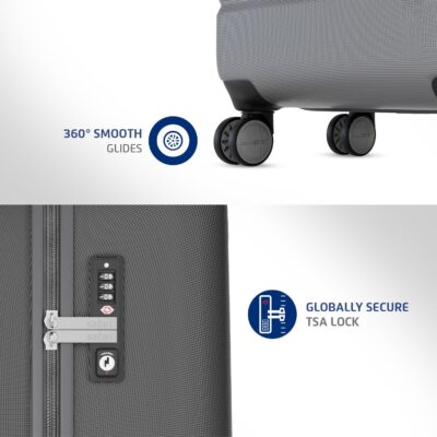 The Safari Aviator 50 cm Cabin Overnighter Laptop Trolley Bag is a premium compact travel solution crafted for short business trips, weekend getaways, and carry-on travel. Made from tough yet lightweight polycarbonate, this hard case suitcase delivers exceptional durability and a sleek, modern look in a striking Gun Metal finish. It features a dedicated padded compartment for your laptop, allowing safe and organized storage for tech essentials during transit. The 8-wheel 360-degree wheeling system ensures smooth and effortless movement across all surfaces, whether you’re navigating airport terminals or tight hotel corridors. A built-in TSA-approved lock provides added security for your belongings, especially during international travel. Despite its compact 50 cm size, the bag offers cleverly designed internal compartments that allow efficient luggage organization and hassle-free access to essentials. Its cabin-compatible dimensions make it ideal for overhead compartments, helping you avoid the wait at baggage claims. The telescopic handle and top carry handle enhance convenience and portability, while the water-resistant and impact-resistant shell protects contents from spills and bumps. Ideal for professionals and travelers who prioritize efficiency, style, and mobility, the Aviator blends the functionality of a laptop bag with the structure of a high-performance trolley. Reinforced corners and smooth zippers add long-term reliability, making it a lasting companion for frequent flyers. Whether you’re heading for a day trip or packing light for a weekend, this trolley bag keeps you organized, stylish, and on the move with ease.