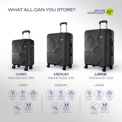 | Size | Cabin | 55 cm | Small, Checkin | 65 cm | Medium, Checkin | 75 cm | Large, Set of 2 ( 55 cm/65 cm ), Set of 3 ( 55 cm/65 cm/75 cm) |