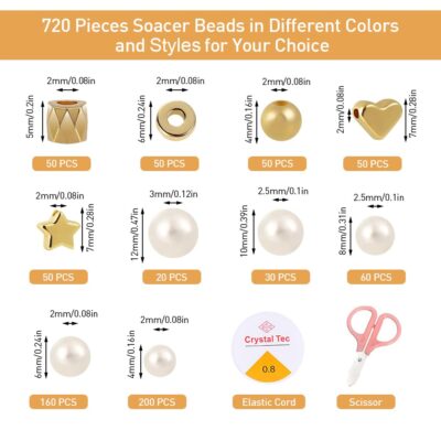 This complete kit includes 720 assorted round pearl beads in multiple sizes, along with golden spacer beads and essential jewelry-making tools to help you design stunning bracelets, earrings, and necklaces with ease.