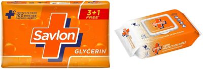 This Savlon combo pack includes multipurpose germ protection wet wipes and glycerine soap for complete hygiene care.