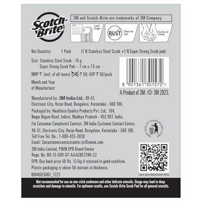 Scotch‑Brite 1 Stainless Steel Scrubber (15 g) and 1 Scrub Pad Combo is a handy kitchen cleaning duo designed to tackle stubborn grease and grime with ease. This combo includes a compact stainless-steel scrubber that’s strong yet easy to hold, making it ideal for scrubbing pots, pans, grills, and heavily soiled cookware without scratching the surface. The stainless-steel construction resists rust and retains its shape for repeated use, giving reliable performance in everyday cleaning chores. Alongside the steel scrubber, you get a Scotch-Brite scrub pad that features abrasive fibers perfect for cleaning regular cooking utensils, plates, and sinks — effectively cutting through food residue and stains while being gentle enough for routine use. This combination brings versatile cleaning power in a compact set, making dishwashing faster and more efficient.