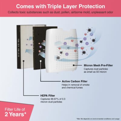 The Sharp Air Purifier uses Japan’s Plasmacluster Technology to remove bacteria, viruses, mold, and VOCs for cleaner, healthier air. Ideal for rooms up to 250 sq. ft., it features a 3-stage HEPA, Carbon, and Pre-filter system.