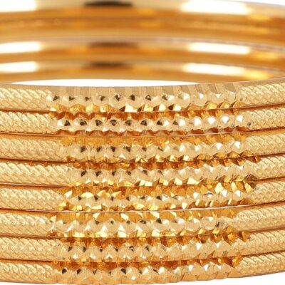 Enhance your traditional look with this beautiful set of 8 bangles from Shining Diva Fashion. Plated with one gram gold, these bangles offer a rich, lustrous finish that brings out classic elegance without the high price tag. Each bangle features traditional design elements that reflect timeless style and cultural charm — perfect for festive occasions, weddings, family functions, or everyday ethnic wear. Lightweight and comfortable to wear, this set pairs effortlessly with sarees, salwar suits, lehengas, and other traditional outfits. A wonderful choice for women and girls who love to embrace cultural fashion with a modern twist, and also makes a thoughtful, stylish gift.