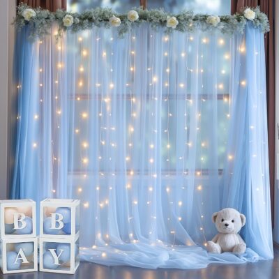 Create a dreamy and romantic ambience with this elegant Sky Blue Net Backdrop Decoration Set. The pack includes 2 soft sheer nets (7×3.5 ft approx), 10m warm LED lights, 1 satin ribbon, and 2 hooks, making it a complete and ready-to-use décor solution for any special occasion.