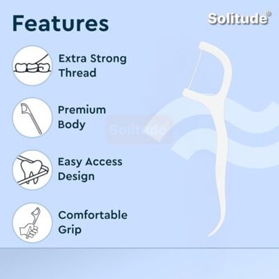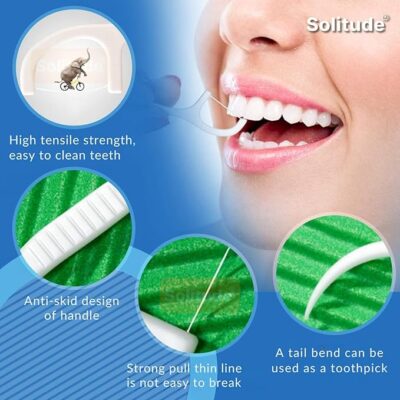 Solitude 3-in-1 Tooth Cleaning Dental Floss Picks (Pack of 100) are convenient disposable oral care tools designed for complete daily hygiene. Each piece combines dental floss, a toothpick, and a tongue cleaner, helping remove food particles, plaque, and bacteria for fresher breath and healthier gums. Easy to use and gentle on teeth, these floss picks are ideal for home use, travel, office, and on-the-go cleaning. Hygienic and single-use, Solitude dental floss picks provide an effective and practical solution for maintaining oral cleanliness anytime, anywhere.