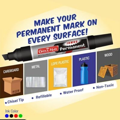 The Soni Officemate Jumbo Permanent Marker (Black, Pack of 2) is designed for bold, clear, and long-lasting marking on a variety of surfaces. Its jumbo chisel tip delivers thick, highly visible lines, making it ideal for labeling boxes, writing on cartons, signage, and everyday office or warehouse use. Filled with rich, quick-drying black ink, this marker resists smudging and ensures strong permanence on paper, plastic, metal, wood, and more. The sturdy body offers a comfortable grip for extended use, while the cap keeps the marker sealed to prevent drying. Perfect for home, office, industry, and school applications.