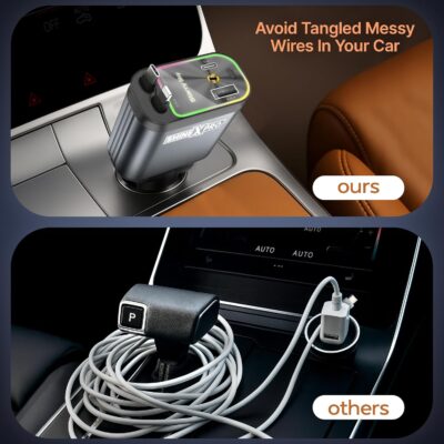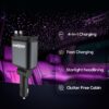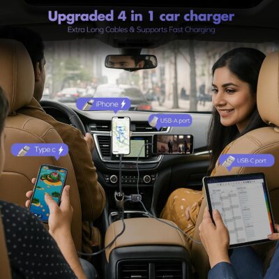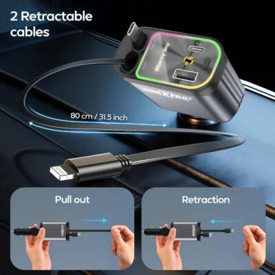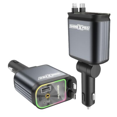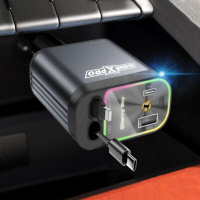 The Starlight Retractable Car Charger is a versatile and visually striking charging solution designed for modern drivers. Featuring 4-in-1 functionality, it includes extra-long retractable cables for both Type-C and iPhone devices, reducing clutter while keeping your car organized. With a powerful 120W fast charging capacity, this charger delivers rapid and efficient power to multiple devices simultaneously, supported by dual USB ports for added convenience. The standout feature is its starry sky-inspired LED light design, adding a unique decorative touch and making it easy to locate at night. Compatible with both Android and iPhone, this retractable car mobile charger combines performance, style, and practicality—perfect for road trips, commuting, and everyday use.