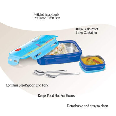 – Insulated tiffin box with leak-proof inner container, steel spoon and fork, and keeps food hot for hours