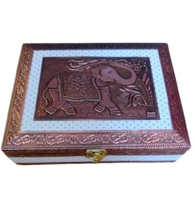 This decorative storage box features a traditional elephant design that adds charm and cultural elegance to any dressing space. Crafted to organize earrings, rings, chains, and tiny valuables, it helps keep daily accessories neatly arranged. Its compact structure makes it both portable and easy to store on dressers or inside wardrobes. The vibrant artwork enhances its appeal, making it perfect for gifting during festivals, pooja events, and celebrations. Sturdy construction ensures durability and safe storage for delicate items. Lightweight and versatile, it blends functionality with decorative value. Ideal as a thoughtful return gift for women, it brings beauty and practicality together in a single box.