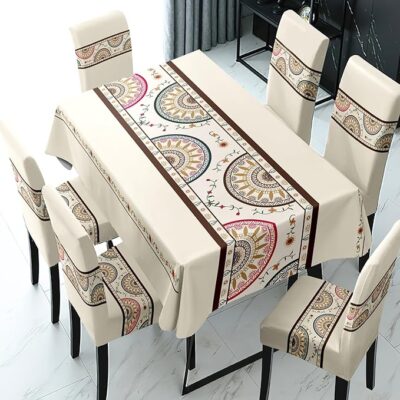 Styley's Dining Table Cover 6-Seater Waterproof with Chair Covers | Table Cover Cloth | Dining Table Cover Cloth Combo - 1 Table Cover + 6 Chair Cover, Cream Mandala Print, XKFSZB-10
