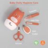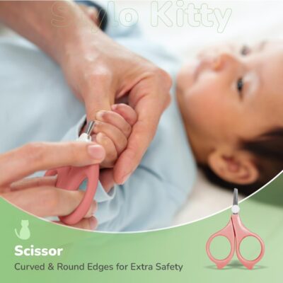 Stylo Kitty New Born Baby 4-in-1 Nail Grooming Kit provides a safe and gentle manicure set for infants. It includes a baby nail cutter, tweezer, filer, and scissors in a convenient peach-colored kit.