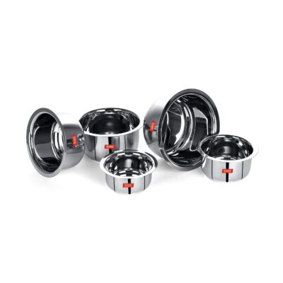 Upgrade your kitchen with the Sumeet Stainless Steel Friendly Tope/Patila Cookware Set (5 Pcs), designed for durability, convenience, and modern cooking needs. Made from high-quality stainless steel, these topes feature a glossy finish and are built to last, making them perfect for daily use.