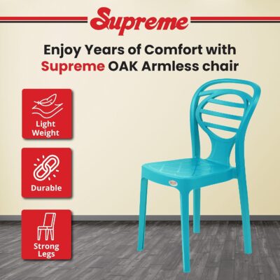 The Supreme Oak Armless Plastic Chair (Aqua Blue, Pack of 2) delivers durable, everyday seating designed for both residential and commercial spaces such as dining rooms, cafeterias, restaurants, patios, and outdoor gatherings. Crafted from high-quality polypropylene plastic, these armless chairs are lightweight yet sturdy, and they support a weight bearing capacity of up to 120 kg, ensuring reliable performance for adults and guests alike. Their simple, ergonomic design offers comfortable seating without armrests, while the smooth surface and easy-to-clean build make upkeep effortless — perfect for active homes or busy eateries. With a vibrant aqua blue finish, these chairs bring a modern, cheerful look to any setting, and the pack of two provides convenient, ready-to-use seating that’s ideal for everyday use indoors or outdoors.