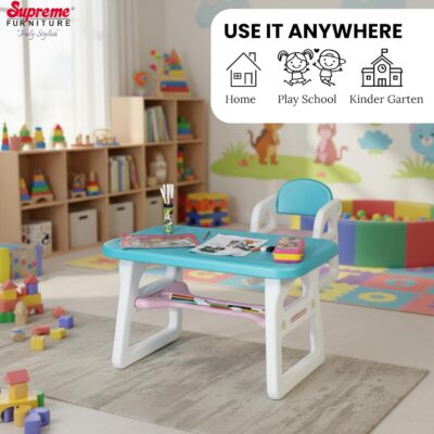 The Supreme Trendy (often referred to as the Bambino Plastic Kids Chair & Table Set) is a versatile and kid-friendly furniture combo designed to make both study time and playtime enjoyable. Made from durable, waterproof, and easy-to-clean plastic, the set includes a comfortable chair and a foldable study table that offers an open play space ideal for drawing, crafts, reading, or snacks — perfect for children’s everyday activities at home or outdoors. Its foldable design saves space when not in use, and the lightweight construction makes it easy for parents to move or adjust the setup as needed. With smooth edges and child-safe materials, this set delivers comfort, convenience, and functional style in cheerful colours like white, pastel blue, and pink, encouraging kids to learn and play in a comfortable environment.