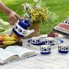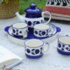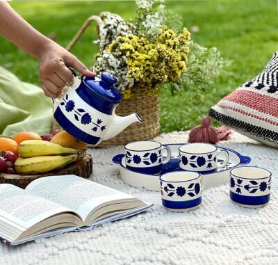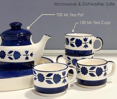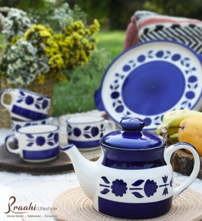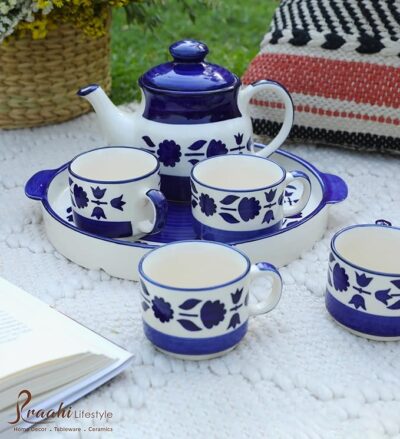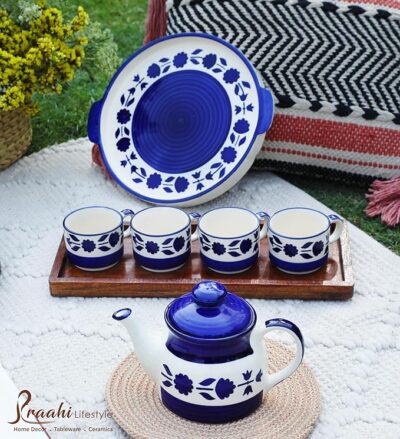 Tea Cup Set with Kettle & Serving Tray – Handpainted Blue Floral Ceramic Tea Set (6-Piece Set) is an elegant and thoughtfully designed serving collection, perfect for special occasions and everyday tea moments. This beautifully crafted set includes 4 tea cups (150 ml each), 1 kettle (700 ml), and 1 matching serving tray, offering a complete and convenient setup for serving tea or coffee. Featuring a handpainted blue floral design, the ceramic set adds a timeless, artistic charm to your table setting. Made from high-quality ceramic, it is microwave safe and easy to maintain. Ideal as a wedding gift, housewarming present, or festive gifting option, this tea set combines graceful aesthetics with practical functionality for memorable tea experiences.