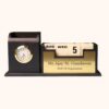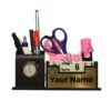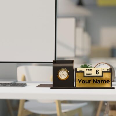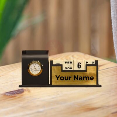 This Teak Wood Personalized Desk Organizer features a pen stand, calendar, watch stand, and storage space in a stylish black finish. It makes an elegant and functional addition to office tables and a premium gift for professionals.