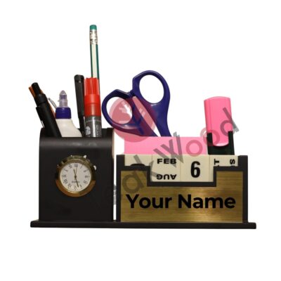 This Teak Wood Personalized Pen Stand Desk Organizer is crafted with a premium wooden build and designed to offer multiple functions in a single elegant unit. It includes a dedicated pen stand, a built-in calendar, and a convenient watch stand to keep essential items neatly arranged. The rich black finish adds a refined look that complements executive desks and modern workspaces. Its personalized touch makes it a thoughtful and stylish gift for bosses, doctors, and corporate professionals. The sturdy wooden construction ensures long-lasting durability while maintaining a sophisticated aesthetic. Ideal for organizing stationery, accessories, and daily-use items, it keeps your workspace clean and efficient. This multifunctional organizer elevates both décor and productivity by combining practicality with timeless elegance.