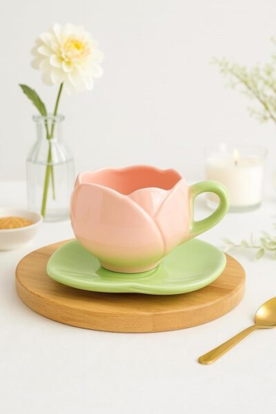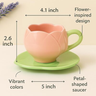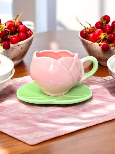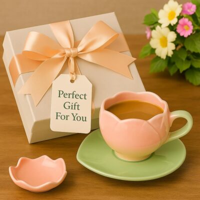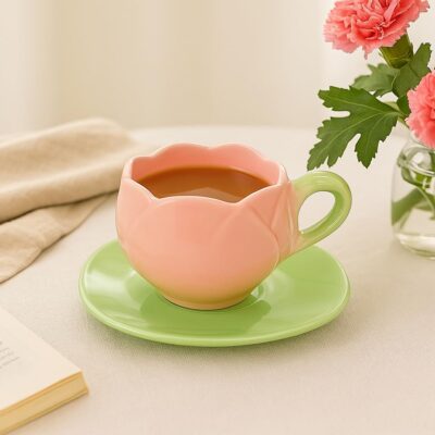 The Deluxe Creations Tulip Shaped Ceramic Cup & Leaf Saucer Set in Pink combines charm and practicality. Each 275 ml cup is handmade, microwave safe, and makes an elegant gift for Rakhi, home, or kitchen use.