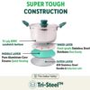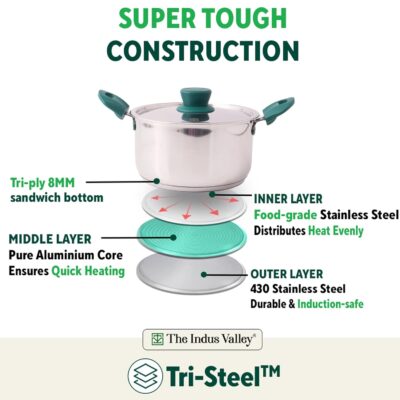 The tri-ply sandwich bottom combines 3 layers of metal for even heat distribution, preventing food from sticking or burning while saving fuel. Its sturdy construction is durable, scratch-resistant, and rust-proof, designed to last for decades.