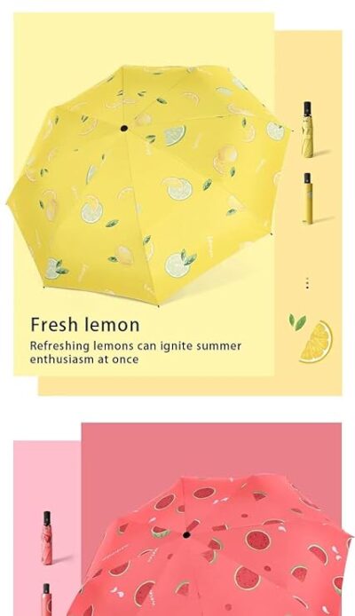 Stay stylish and protected with The Purple Tree 2-Fold Automatic Fruit Print Umbrella. Designed with vibrant summer fruit patterns like watermelon, lemon, avocado, peach, and citrus, this umbrella adds a refreshing touch to your everyday carry. The high-density vinyl-coated polyester canopy provides UPF50+ sun protection and excellent waterproof performance, ensuring safety in both sunny and rainy weather. Its compact 6.7-inch foldable design and lightweight build make it easy to slip into handbags, school bags, or backpacks. Built with a sturdy 6-rib aluminum and fiberglass frame, it stays stable against light to moderate winds without flipping inside out. Featuring convenient automatic open/close functionality, this umbrella is perfect for travel, commuting, and daily use. A cheerful and practical gift option for kids, teens, and adults alike.