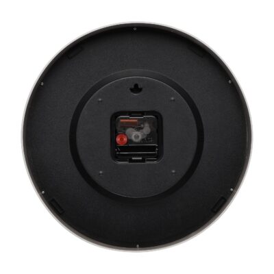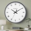 Silent‑sweep grey plastic wall clock, 29.5 cm round, with minimalist numerals and quiet quartz movement.