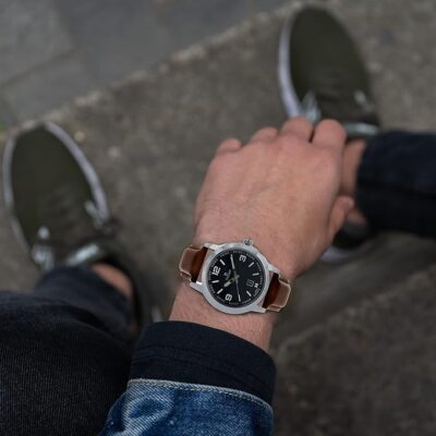 Stylish black‐dial stainless steel watch with clean lines and modern appeal.