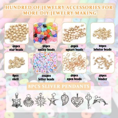Tocxes Clay Beads Kit 24 Colors Clay Beads for Bracelet Making Set, Polymer Flat Letter Spacer Bead with Charms Elastic Strings DIY Craft, Gift for Girls Kids Women, Multi- Color