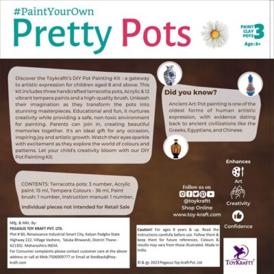 Encourage artistic expression with the TOYKRAFTT Paint Your Own Art Kit – Pretty Pots. Designed for kids aged 8 to 12 years, this creative kit allows children to paint and personalize small pots, transforming them into colorful decorative pieces. The kit includes all necessary paints and brushes, making it easy for beginners to start their artistic journey. Perfect for gifts, birthday activities, or home craft sessions, it fosters creativity, focus, and fine motor skills while providing hours of fun and hands-on learning. Ideal for both girls and boys, these painted pots can be used to decorate rooms, gardens, or desks.