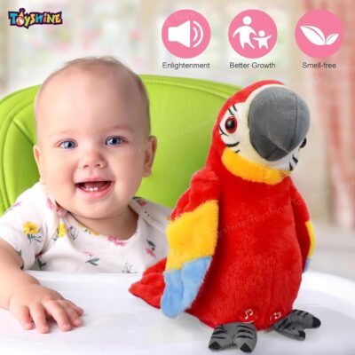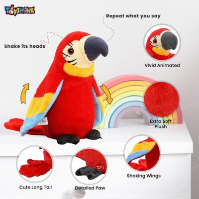 Toyshine Talking Macaw Parrot is a soft plush electronic toy that mimics speech, flaps wings, and shakes while repeating everything kids say. Cute, interactive, and educational, it makes a perfect fun gift for boys and girls.