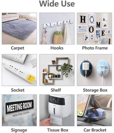 Ideal for mounting photo frames, décor items, organizers, cables, and small accessories, it adheres firmly to surfaces such as glass, metal, tiles, wood, and plastic.