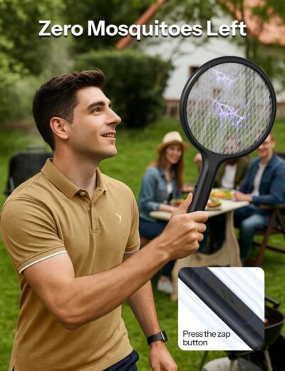 The UN1QUE 2-in-1 Mosquito Racket features 6 UV attraction lights, a 1200mAh long-lasting battery, and a hands-free base stand for dual use as a racket or stationary bug zapper. Ideal for both indoor and outdoor mosquito protection.