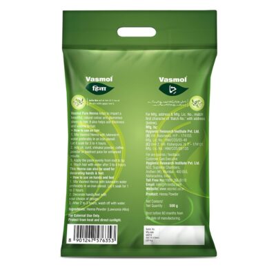 Vasmol Henna 100% Pure Henna Powder is suitable for natural hair coloring and traditional mehndi use. It helps cover grey hair while conditioning and nourishing hair and skin.