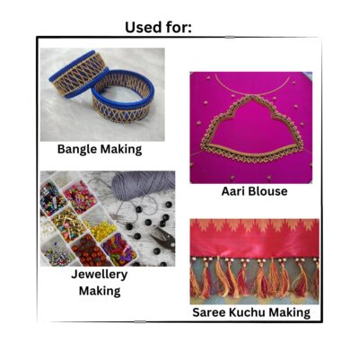 VELVAHINI Cotton A1 Mamtha Zari Thread (Pack of 3 – Gold, Silver & Copper) is a premium-quality metallic embroidery thread ideal for Aari work, Maggam work, tassels, crochet, sewing, and jewellery making. Each spool features a fine 0.1mm thickness, ensuring smooth stitching, high shine, and elegant finish for intricate handcraft designs. Made with durable cotton core and metallic Zari coating, these threads offer strength, flexibility, and a luxurious shimmer that enhances traditional and modern embroidery projects alike. Perfect for blouses, sarees, accessories, and decorative crafts.