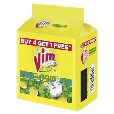 Vim Anti smell Dishwash Bar with Pudina – 190 g (Buy 4 Get 1 Free) is a value pack kitchen cleaning bar designed to tackle tough grease and stubborn food stains while keeping your utensils fresh-smelling. Infused with the cool and refreshing pudina (mint) fragrance, this dishwash bar not only cuts through grease effectively but also helps neutralize lingering Oduors, leaving your dishes sparkling clean and pleasant after every wash. The bar’s powerful cleaning action makes everyday dishwashing easier and more efficient—removing grime with minimal effort. The Buy 4 Get 1 Free offer gives you extra cleaning value, making it ideal for larger households or frequent kitchen use.