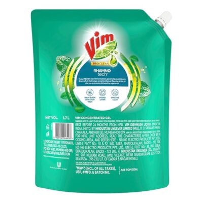 Vim Pro Clean Dishwash Liquid with Mint – 1700 ml is a high-performance dishwashing liquid powered by Rhamno Tech™ to deliver strong grease-cutting and odor-fighting action with every wash. Infused with a refreshing mint fragrance, it leaves your dishes not only sparkling clean but also fresh smelling. Its effective formula tackles tough grease and stubborn food residues while ensuring gentle care for your hands. Ideal for everyday kitchen cleaning, Vim Pro Clean Dishwash Liquid with Mint helps make dishwashing easier, cleaner, and more enjoyable.