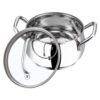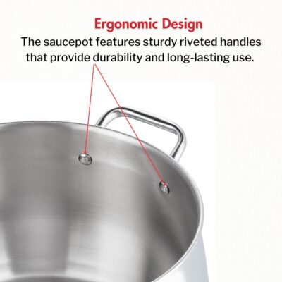 Durable stainless steel saucepot with 1.3L capacity and 2.6 mm thick base for even heat distribution. Comes with glass lid, sturdy riveted handle, and 2-year warranty. Induction and gas compatible.