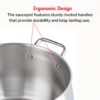 The saucepot is compatible with all cooktops, including induction and gas, making it versatile for modern kitchens. The sturdy riveted handle provides a secure grip, while the sleek glass lid allows you to monitor cooking without lifting it.