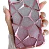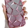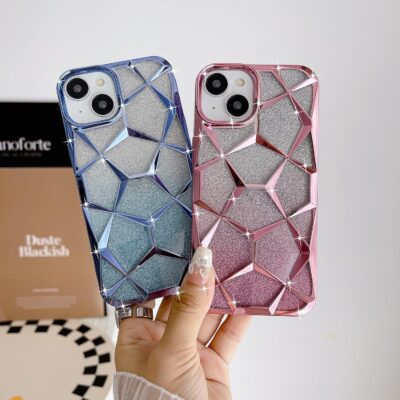 Luxury electroplated gradient glitter case with 3D geometric design, removable glitter layer, and soft TPU protection for iPhone 15.
