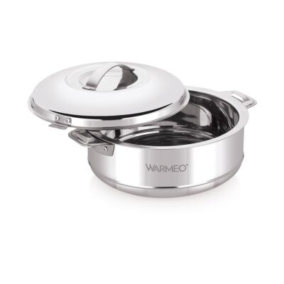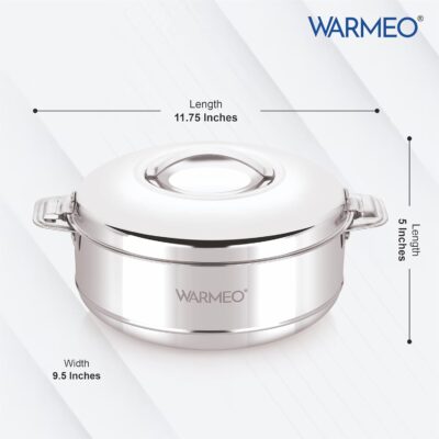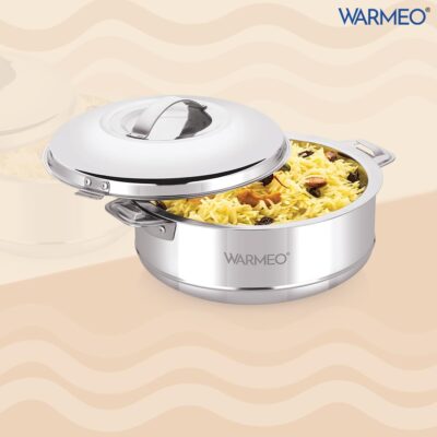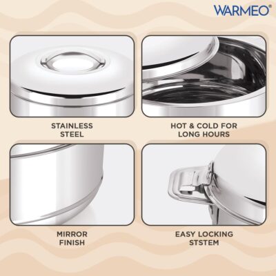 The WARMeo Steam Insulated Stainless Steel Casserole is a 2500ml hot box designed to keep food warm for hours. Its silver finish and easy-to-carry design make it perfect for kitchen, home, or travel use.