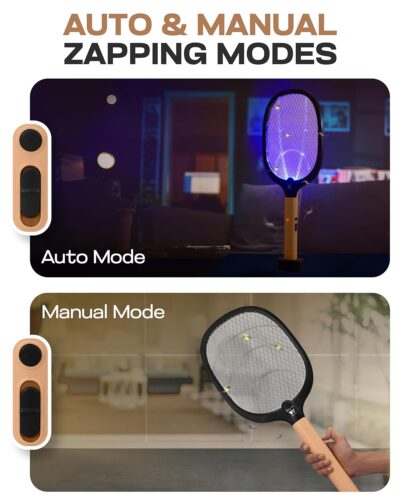 The WEIRD WOLF 2-in-1 Mosquito Bat features Manual & Auto UV Light modes, a 1200mAh rechargeable battery, and USB Type-C fast charging. With a triple-layer safety mesh and base stand, it works as both a fly swatter and hands-free bug zapper.