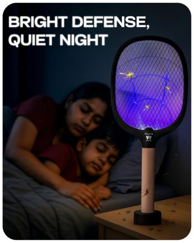 Protect your home with the WEIRD WOLF 2-in-1 UV Mosquito Killer Racket, designed for both manual swatting and automatic hands-free mosquito trapping. Its UV light attracts insects, while the high-voltage mesh instantly kills mosquitoes, flies, and gnats. Powered by a 1200mAh lithium battery, it offers long standby backup and supports USB Type-C fast charging for convenience. Built with a durable aircraft-grade ABS body and a triple-layer shock-proof mesh, it ensures safe and long-lasting use. The included base stand lets you use it as a stationary bug zapper, making it ideal for bedrooms, balconies, and outdoor spaces.