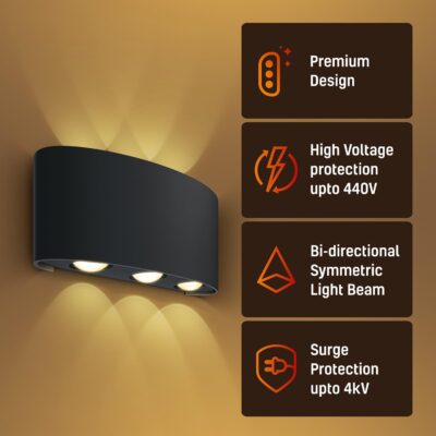 Wipro Garnet 6 Watt 2 Ray Symmetric Up & Down Outdoor Wall Light for Home | 3 x 1W| IP65 LED Wall Light | Warm White, Yellow 2700K | Aluminium Housing |(Black Body, Pack of 1)