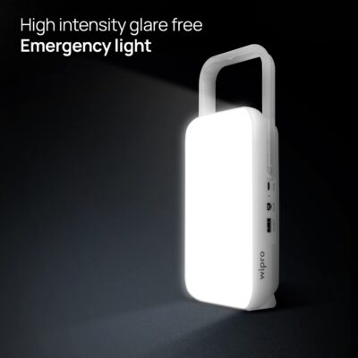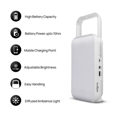 Wipro Safari Emergency Rechargeable LED Lantern features 122 individual LEDs and a 7200mAh battery for long-lasting illumination. It includes brightness control and a built-in mobile charging point for added convenience.