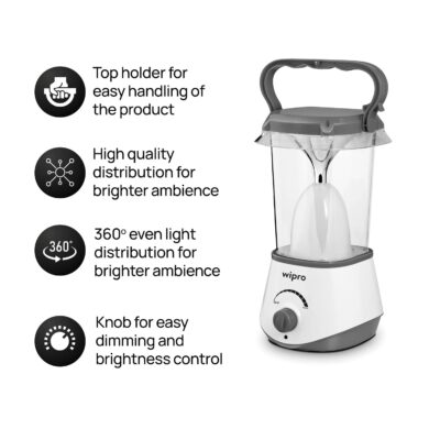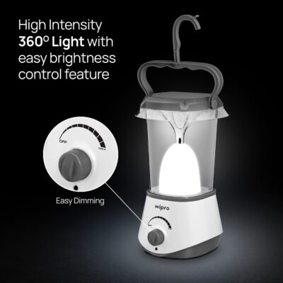 Wipro Solaris 10W Rechargeable Emergency LED Lantern provides 360-degree ambient lighting powered by a 3000mAh lithium battery. Designed for long-lasting use, it ensures reliable illumination during power outages.