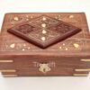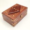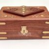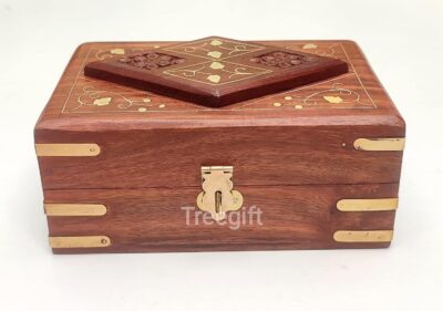 This Sheesham wood jewellery box features elegant hand carving with brass work, offering a stylish way to store rings, earrings, and small accessories. A compact and beautiful gift item perfect for women on special occasions.