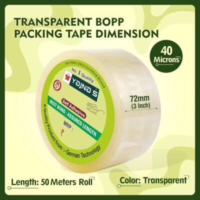 YAJNAS BOPP Clear Tape offers strong, reliable adhesion with a 72mm (3-inch) width and 50-meter length. Ideal for e-commerce packaging, home, office, and box sealing tasks.